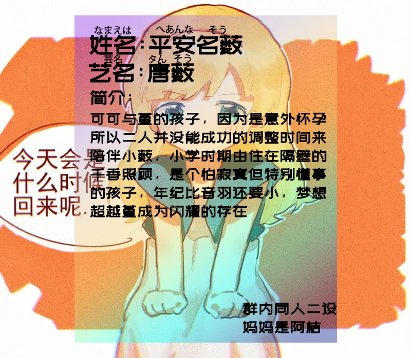 岚千砂都4是涩谷香音的妻子,同时也是涩谷家的家长、可可与堇的高中同学。